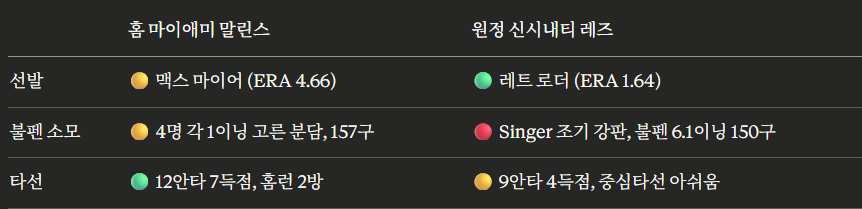 선발 격차가 이 경기의 핵심이다. 로더는 올 시즌 2경기 모두 퀄리티 스타트 이상의 피칭을 해왔고, 마이어는 반대로 5이닝을 넘기지 못하는 흐름이 이어지고 있다. 신시내티 불펜은 전날 과부하가 있었으나, 로더가 길게 던진다면 영향은 제한적이다. 타선은 마이애미가 전날 경기력이 더 좋았지만 로더를 상대로 어느 팀이든 득점에 어려움을 겪어왔다.