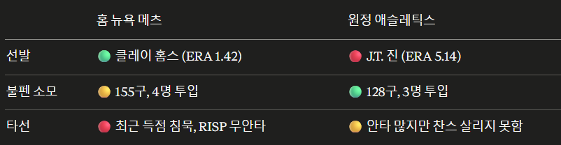 선발 매치업에서 메츠가 확실히 앞선다. 홈스는 ERA 1점대로 시즌 초반 최상의 흐름을 타고 있는 반면, 진은 불펜 출신이 선발로 올라오는 상황이라 이닝 소화 능력과 안정감 모두 불투명하다. 다만 메츠 타선은 최근 ARI 3연전 내내 득점권 찬스를 살리지 못하는 침묵이 이어지고 있어 홈스의 호투에도 결정적인 점수 지원이 부족할 수 있다.