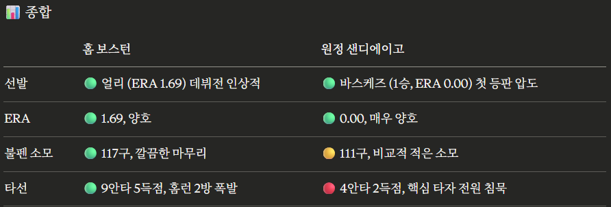 두 선발 모두 ERA가 낮고 이전 등판에서 인상적인 모습을 보였지만, 타선에서 큰 차이가 난다. 보스턴은 마이어·콘트레라스의 홈런으로 흐름을 타고 있는 반면, 샌디에이고는 마치아도·타티스·보가츠 등 핵심 타자들이 모두 침묵하며 시즌 타율이 리그 최하위권에 머물고 있다. 홈팀 보스턴의 승리 가능성이 약간 높아 보인다. 양 선발의 안정감을 감안하면 투수전 양상으로 흐를 가능성이 있다.