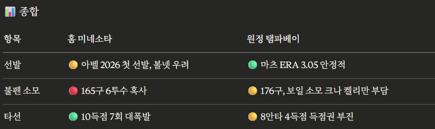 선발에서는 베테랑 마츠가 아벨보다 안정감에서 앞서지만, 미네소타 타선이 전날 대폭발한 흐름과 탬파베이 불펜 전날 176구 소모가 변수다. 아벨의 볼넷 문제가 초반에 발목을 잡을 경우 탬파베이에 유리해질 수 있고, 마츠가 5이닝 이상 버텨줄 경우 탬파베이 불펜 부담도 줄어든다. 타깃 필드는 중간 수준의 구장으로 홈런파크팩터가 특별히 유리하지도 불리하지도 않아 선발 능력이 득점에 직접적인 영향을 미칠 가능성이 높다. 전체적으로 선발 안정감에서 앞선 탬파베이의 승리 가능성이 다소 높아 보인다.
