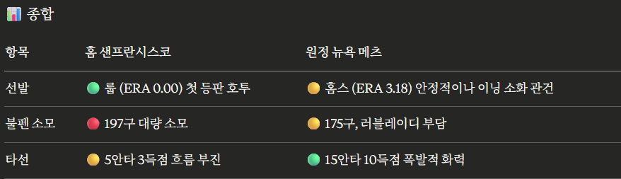 룹의 첫 등판 성적은 인상적이지만 샌프란시스코 불펜이 전날 197구를 소모하며 뎁스에 상당한 부담이 생겼다. 메츠 타선은 전날 15안타 10득점으로 완전히 살아있고 알바레스·세미엔·린도르 등 중심타선의 화력이 무섭다. 홈스도 내야 수비를 등에 업고 효율적인 피칭이 가능한 스타일이다. 오라클 파크는 투수 친화적 구장으로 홈런파크팩터가 낮아 장타보다는 싱글과 주루 중심의 경기 흐름이 나올 가능성이 높다. 타선 흐름과 불펜 소모 격차를 감안하면 뉴욕 메츠의 승리 가능성이 다소 높아 보인다.